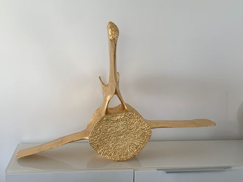 Throughout my education in biology, in addition to wonder, I always felt gratitude to the creatures I dissected, whose inner structures I had the privilege to discover. I feel the same way when I gild the bones of a whale. I think of one whale in particular, who sadly died offshore and washed onto the beach near where I live. When the micro-organisms, sun, and salt air had done their work and scrubbed the flesh off the bones, a friend brought me one of the vertebrae to gild. With every centimeter of bone surface that I explored and covered with gold, I thought of that whale, who had probably never been touched by a human; I reflected humbly on its life in the ocean, and I thanked it for allowing me to touch it in an effort to bring it in some tiny way back to life.